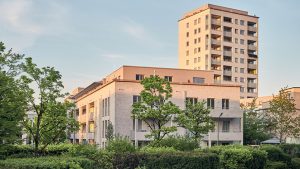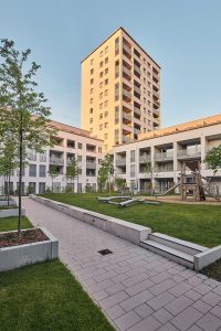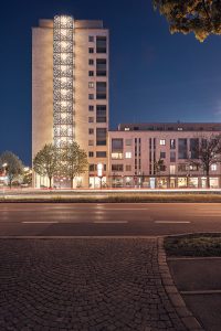 Besonders prägend ist das herausragende Architekturkonzept des renommierten Büros Goergens und Miklautz. Mit Klinkerfassaden, klaren Formen und einem großzügig begrünten Innenhof fügt sich das Quartier harmonisch in die Umgebung ein. Herzstück des Ensembles ist der 14-geschossige Wohnturm, dessen Treppenhaus-Fassade von einem emporfliegenden Vogelschwarm geprägt ist und bietet vor allem bei Nacht ein eindrucksvolles Spiel aus Licht und Schatten.